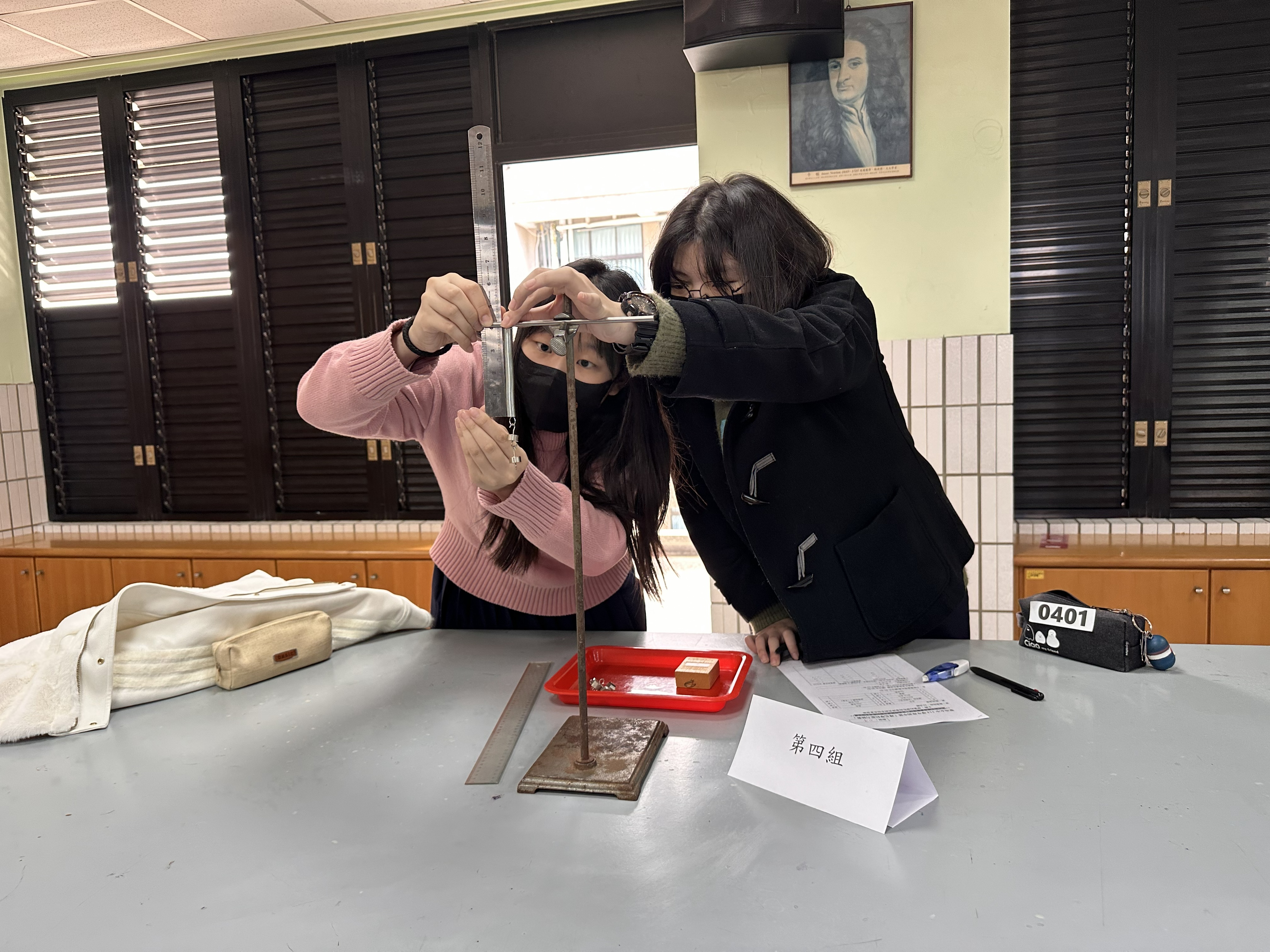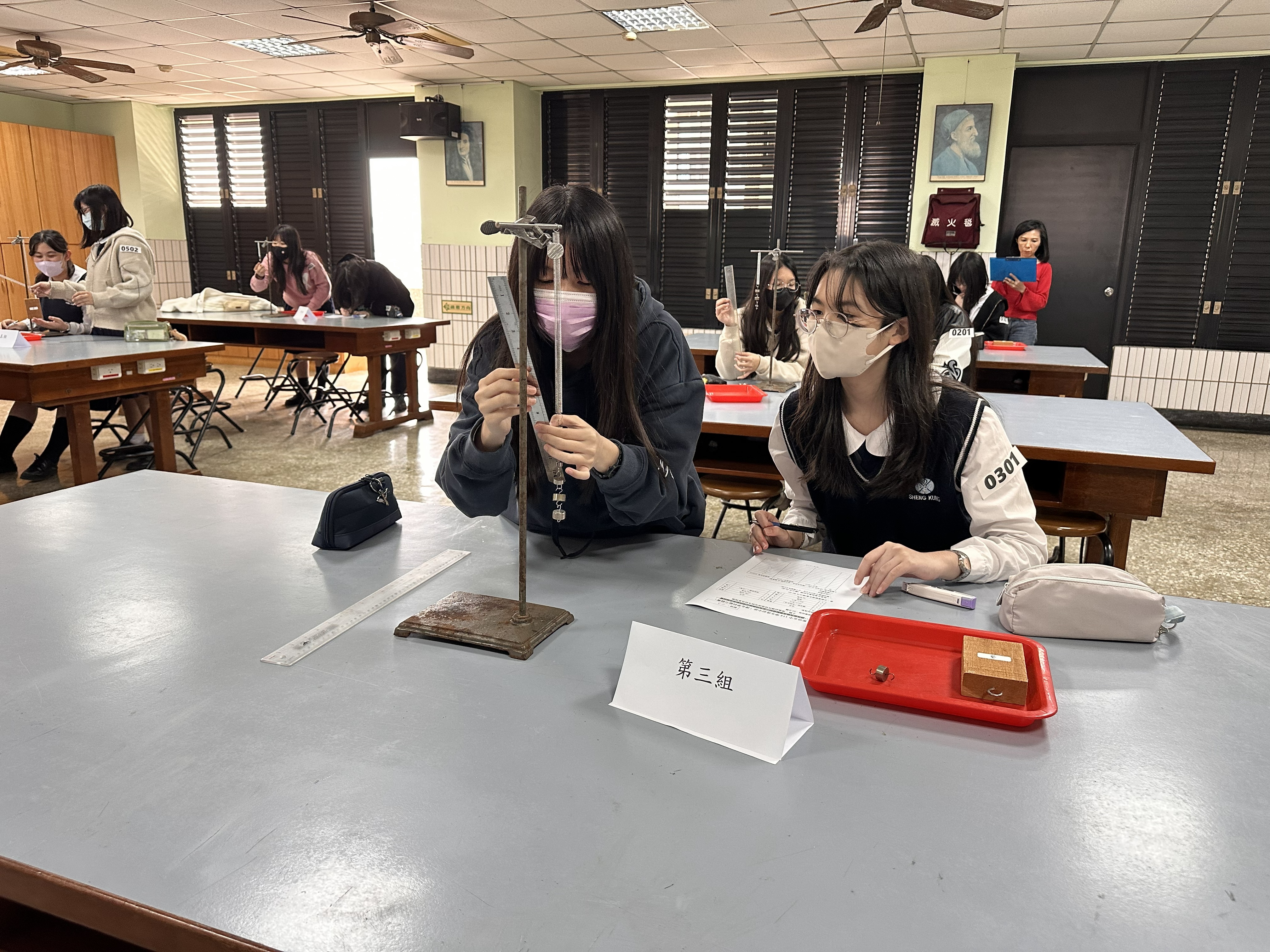 自然科實驗競賽於在實驗室內舉行,旨在提升學生科學實作能力。學生進行科學實驗,專注觀察彈簧長度變化,記錄數據,展現團隊合作與探究精神。競賽結合理論與實踐,激發學子對科學的興趣。