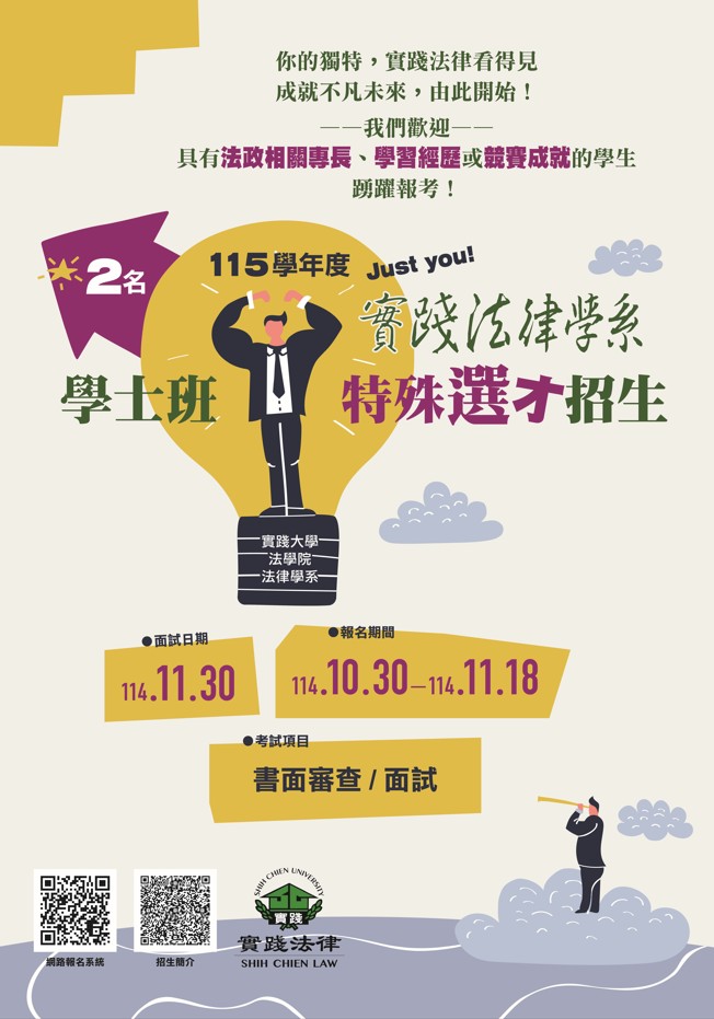一、特殊選才網路報名時間自114年10月30日(星期四)起至11月18日(星期二)止,詳細內容請參閱招生簡章、文宣或實踐 大學法律學系網頁。