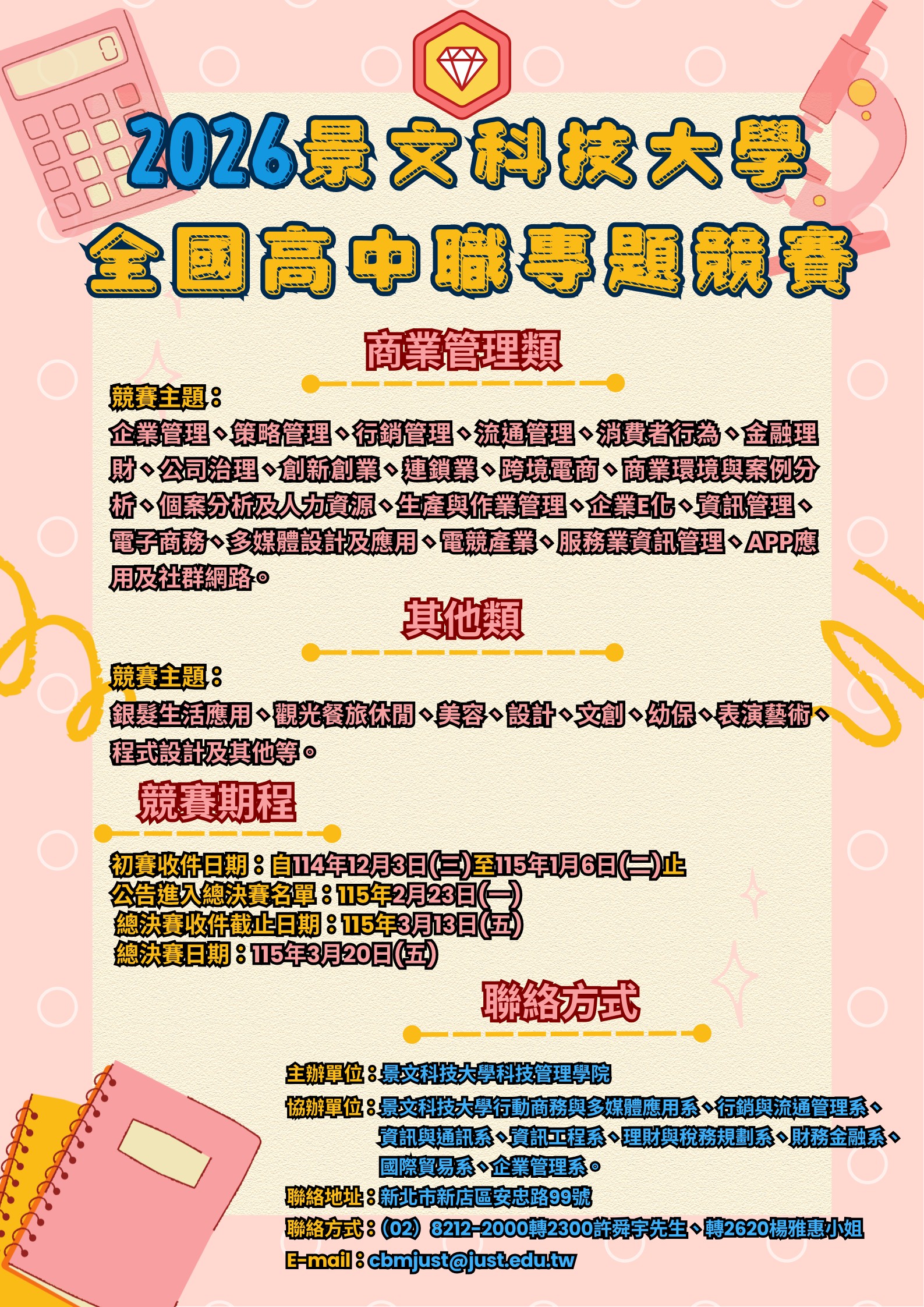 景文科技大學科管學院辦理之「景文科技大學2026全國高中職 專題競賽」,活動計畫書及海報各1份